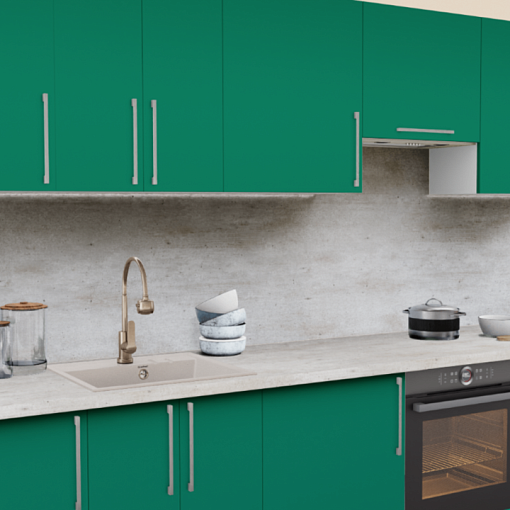 Яркие кухонные фасады стали одним из актуальных трендов для кухонных гарнитуров. В этом решении используются практичные матовые фасады цвета аквамарин, дополненные акцентными стальными ручками. Столешница в нейтральной цветовой гамме оттеняет насыщенные цвета шкафов, смягчая общую картину.