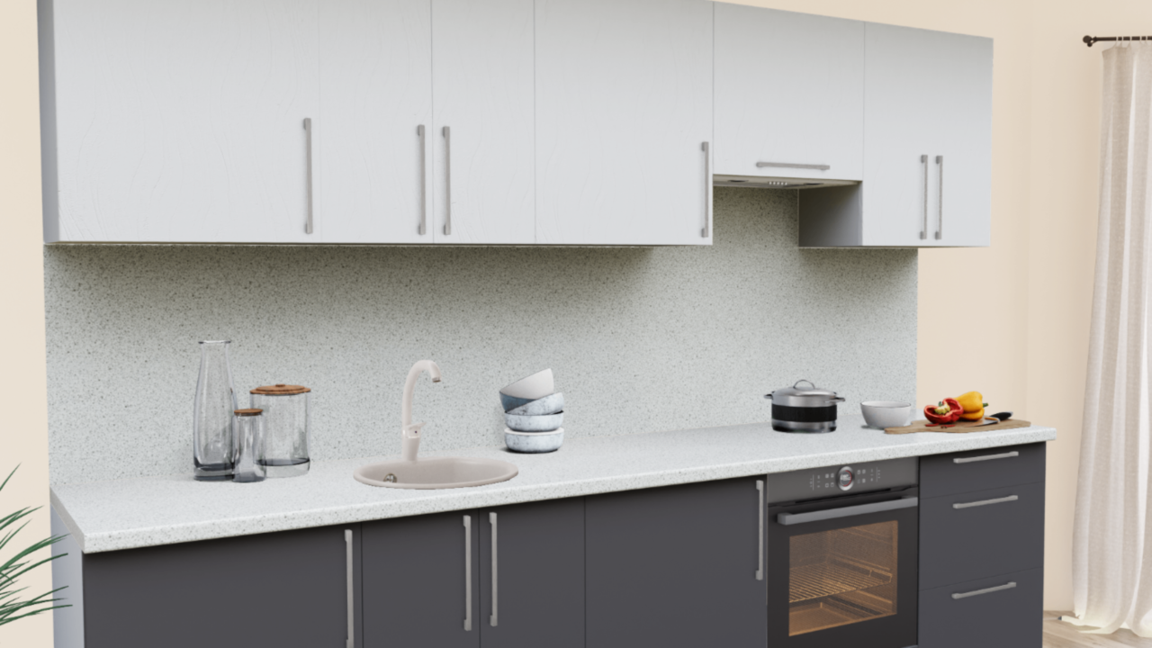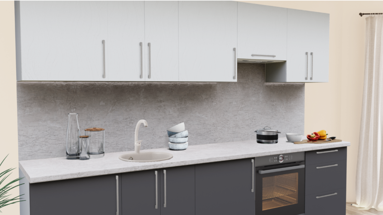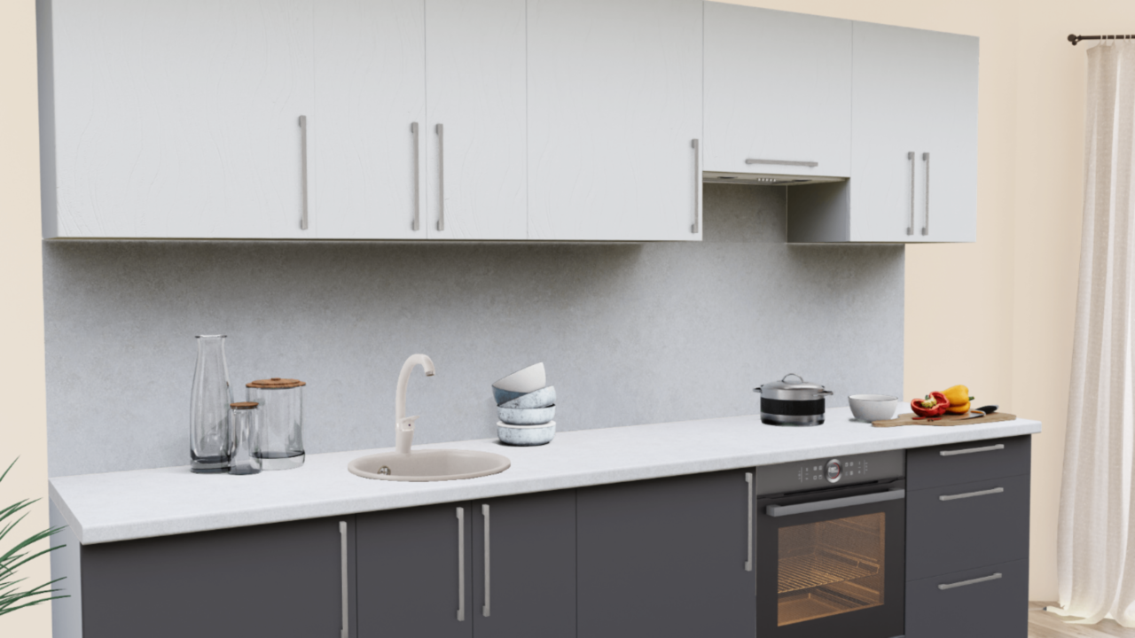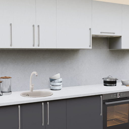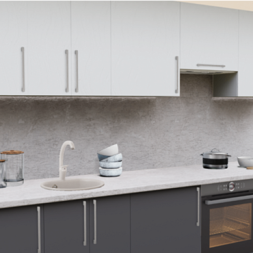 Кухонный гарнитур в сочетании серых и белых фасадов - актуальный тренд в дизайне и прекрасное решение для лаконичного интерьера. Нейтральная или более контрастная столешница позволит подобрать вариант для любого размера помещения. Современные ручки удобной формы добавят оригинальности этой кухне.