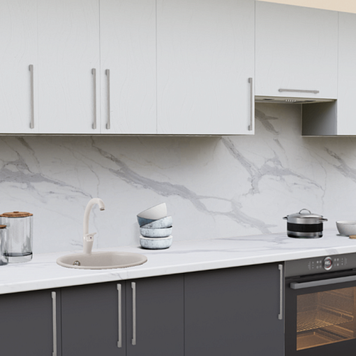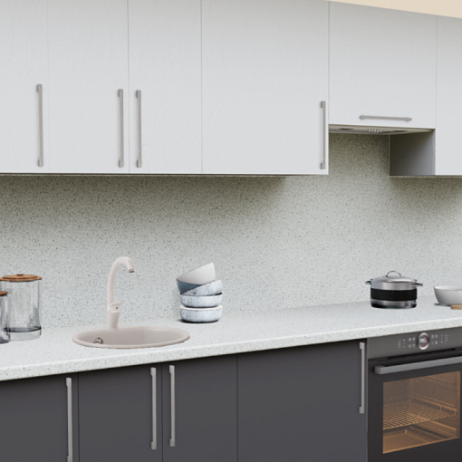 5. Прямая кухня Белый бархат 2204 со столешницей 4040-S Антарес и со стеновой панелью 4040-S Антарес.