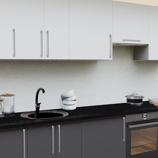 4. Прямая кухня Белый бархат 2204 со столешницей 1021-Q Черный и со стеновой панелью 1210-Br Бриллиант белый.