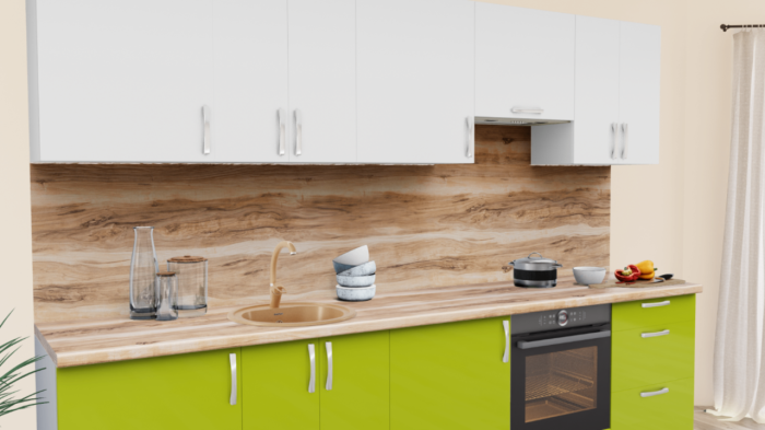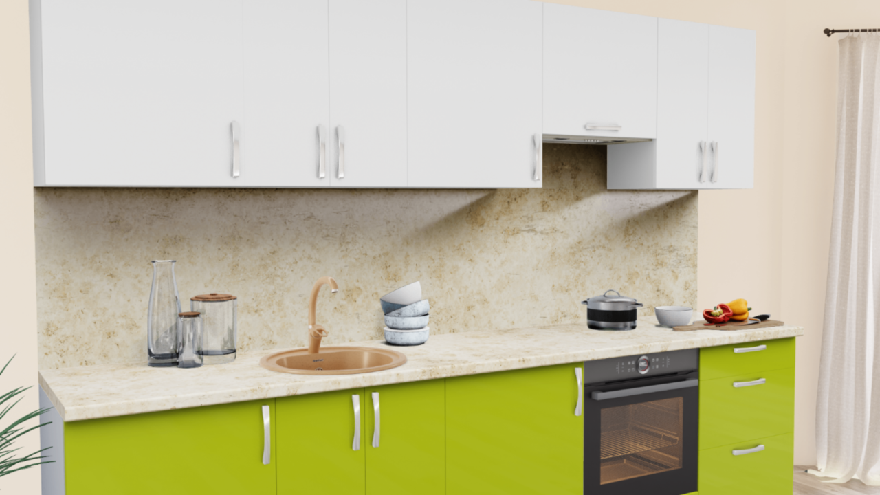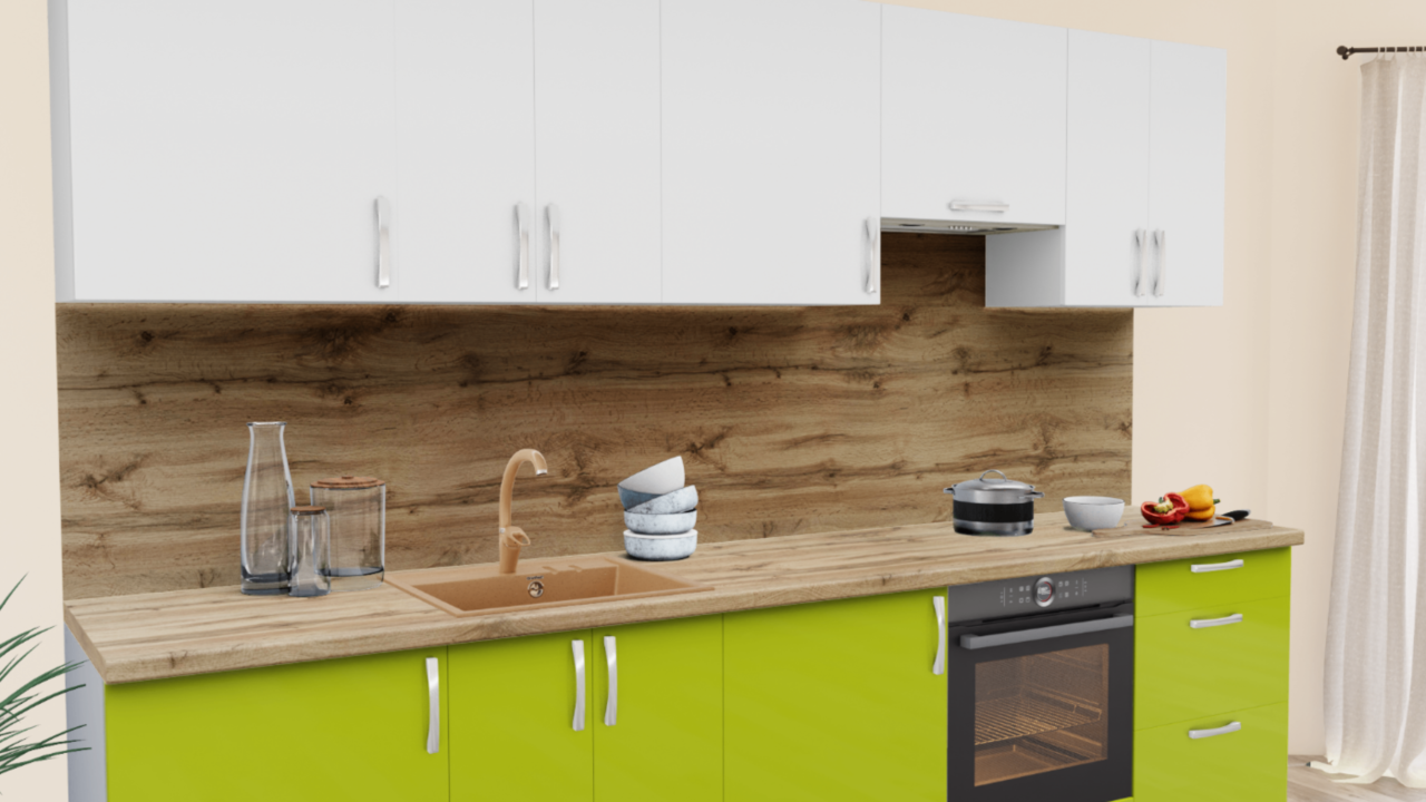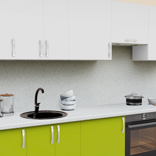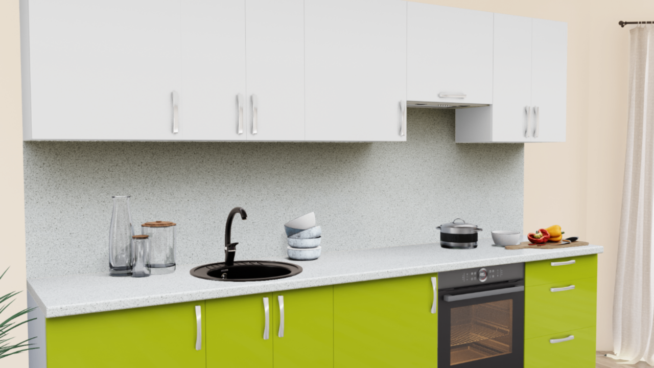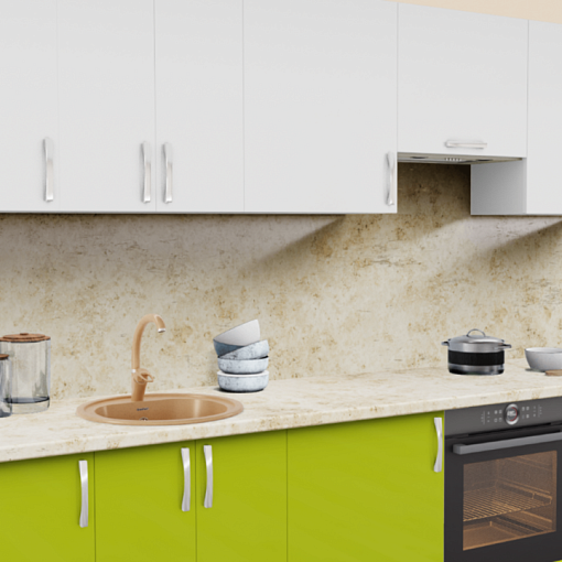 Яркая кухня с глянцевыми фасадами и акцентными столешницами - решение для тех, кто хочет добавить цвета в интерьер. Сочный оттенок лайма на нижних шкафах добавит позитивного настроения, а белый глянец верхних фасадов и хромированные ручки, позволит кухне гармонично смотреться в абсолютно любом помещении.
