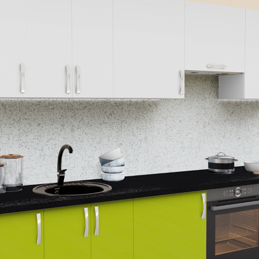 4. Прямая кухня Белый глянец 6G со столешницей 1021-Q Черный и со стеновой панелью 2919-S Ассиметрия