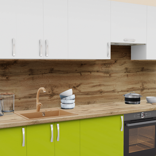 6. Прямая кухня Белый глянец 6G со столешницей 5270-FL Дуб классический и со стеновой панелью 5270-FL Дуб классический.