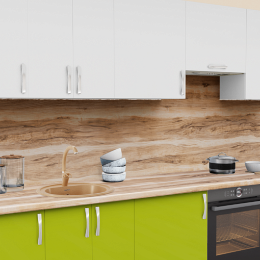 2. Прямая кухня Белый глянец 6G со столешницей 521-S Береза Сандал и со стеновой панелью 521-S Береза Сандал.