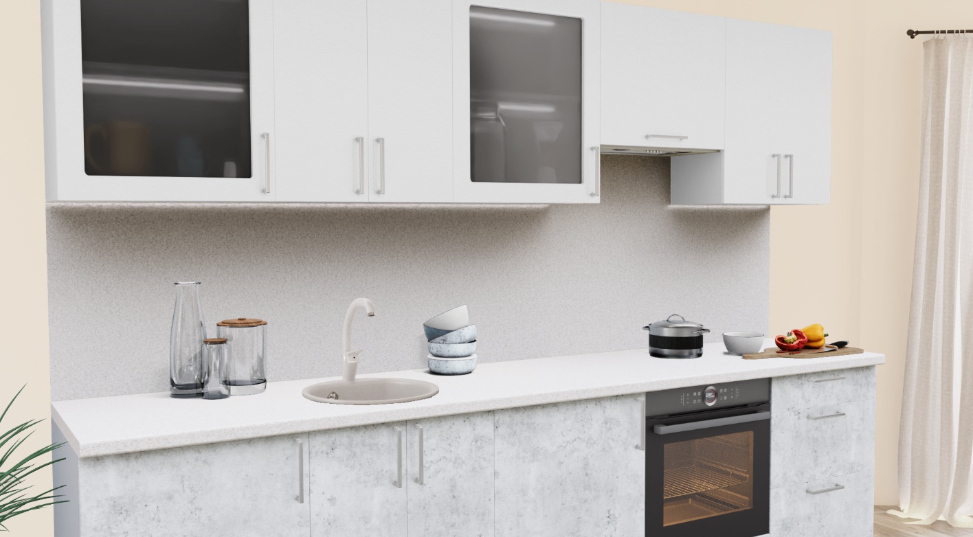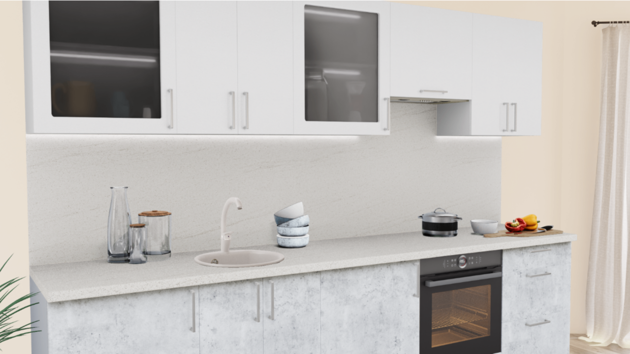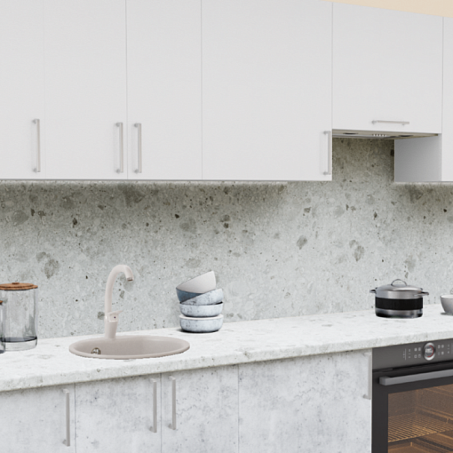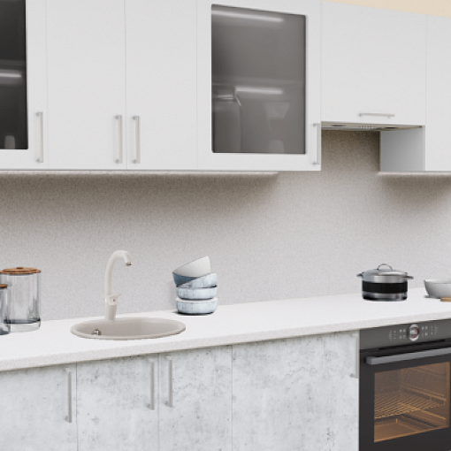 1. Прямая кухня Белый матовый 12027 со столешницей 2235-S Семолина серая и со стеновой панелью 2235-S Семолина серая.