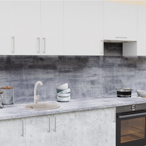 3. Прямая кухня Белый матовый 12027 со столешницей 2323-S Этна и со стеновой панелью 2323-S Этна.