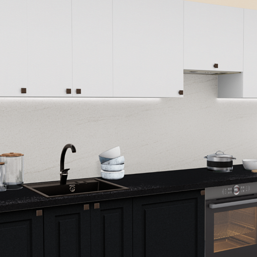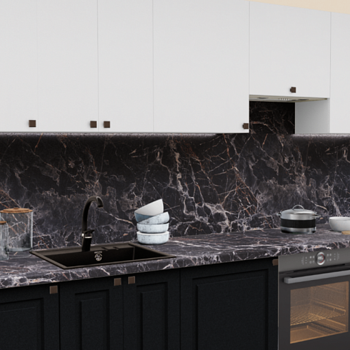 1. Прямая кухня Белый матовый 14027 со столешницей 1021-Q Черный и со стеновой панелью 2323-S Этна.