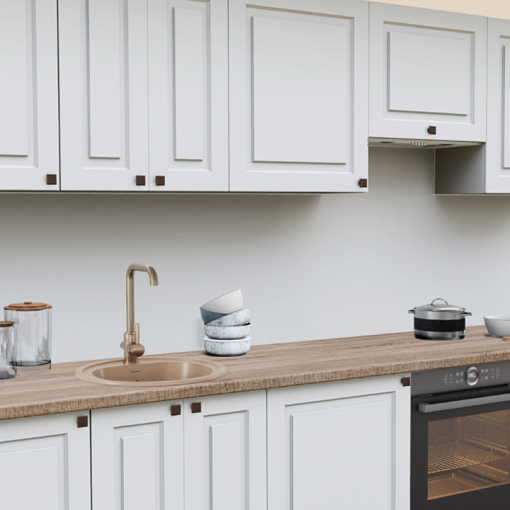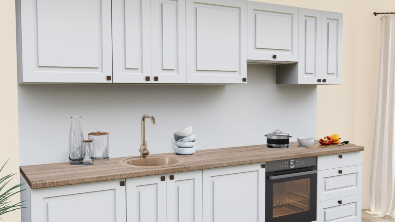 2. Прямая кухня Белый софт 3005 Прямоугольник со столешницей 232-S Дуб Ниагара и со стеновой панелью 1110-S Белый.