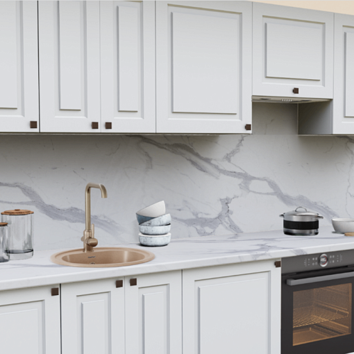 Классический кухонный гарнитур - это белые матовый фасады с фрезеровкой в сочетании с глянцевой столешницей под мрамор и лаконичной лицевой фурнитурой.