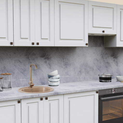 3. Прямая кухня Белый софт 3005 Прямоугольник со столешницей 3027-S Гранит белый и со стеновой панелью 3027-S Гранит белый.