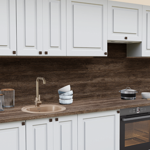 4. Прямая кухня Белый софт 3005 Прямоугольник со столешницей 2072-Р Дуб Мокко и со стеновой панелью 2072-Р Дуб Мокко.