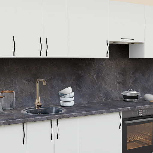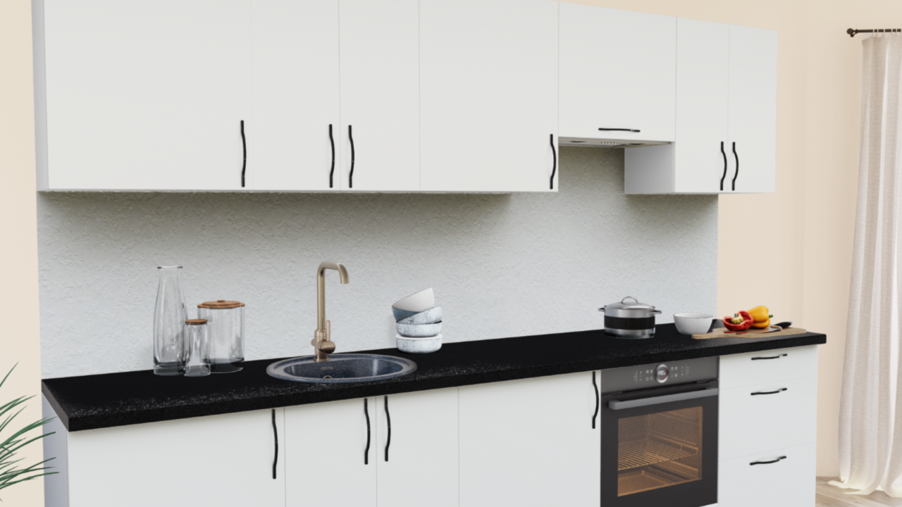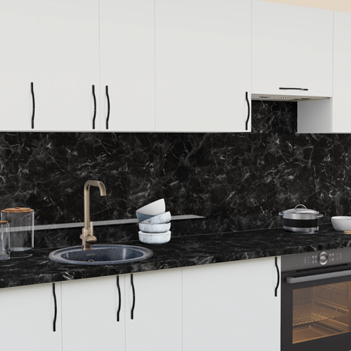 3. Прямая кухня Белый теплый 1200 со столешницей 1021-Q Черный и со стеновой панелью 1210-Br Бриллиант белый.