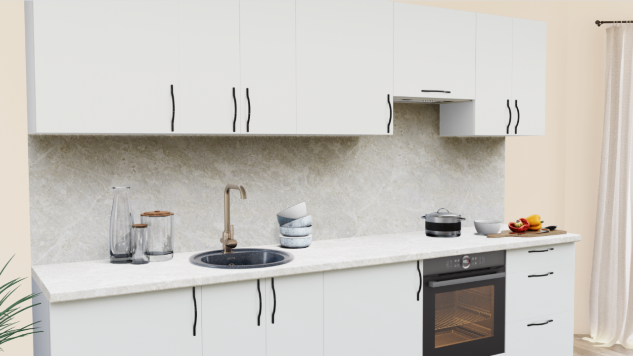 4. Прямая кухня Белый теплый 1200 со столешницей 727-1 Гранит белый и со стеновой панелью 727-1 Гранит белый.