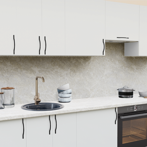 2. Прямая кухня Белый теплый 1200 со столешницей 694-SL Мрамор марквина серый и со стеновой панелью 694-SL Мрамор марквина серый.