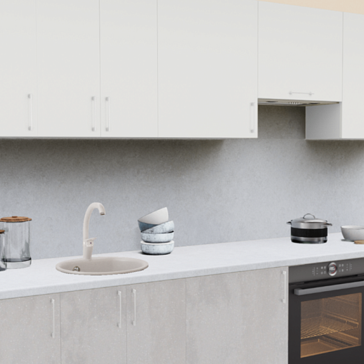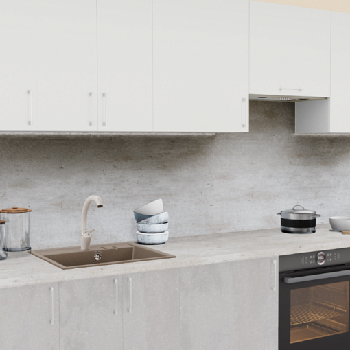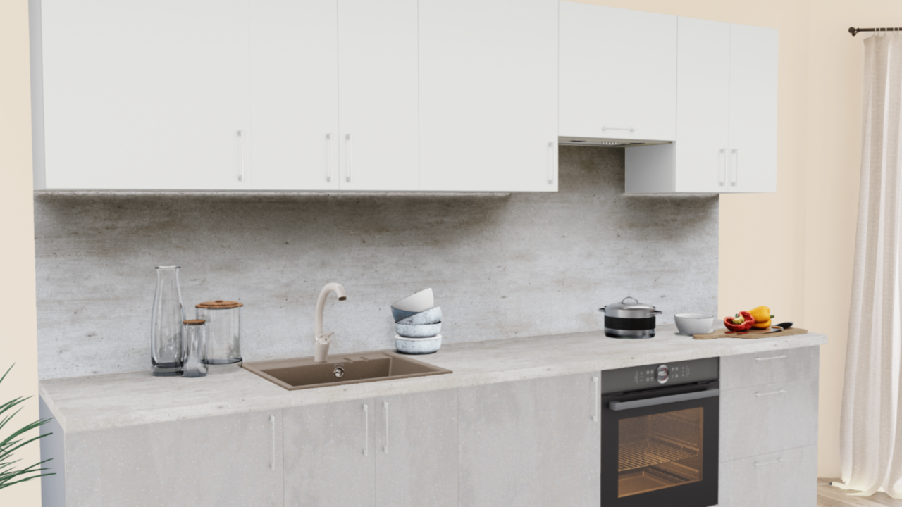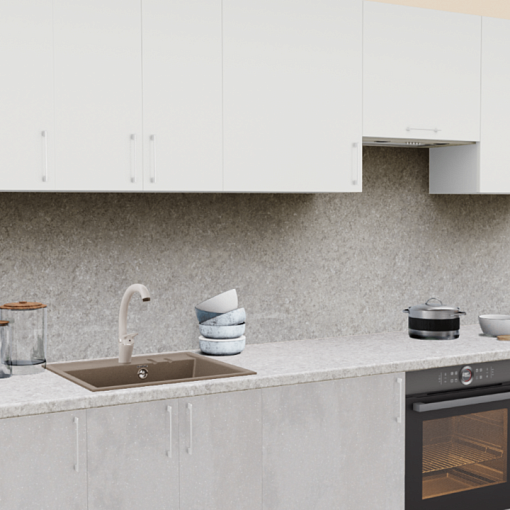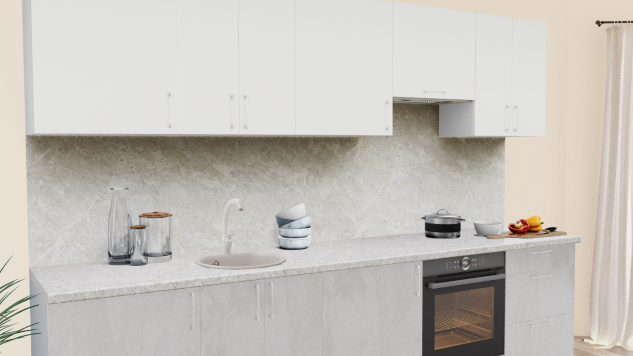 Кухонный гарнитур в стиле минимализм - современное решение, доступное для любого размера помещения. Приглушенные бело-серые оттенки на фасадах и столешнице в сочетании с эргономичными ручками создают единую композицию, принося в кухню ощущение воздушности и легкости.