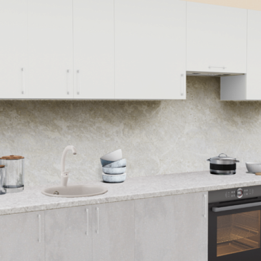 2. Прямая кухня Белый теплый 1200 со столешницей 2946-R Галия и со стеновой панелью 2946-R Галия.