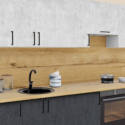 3. Прямая кухня Светлый бетон 1865 со столешницей 3829-NW Дуб Бунрати и со стеновой панелью 3829-NW Дуб Бунрати.