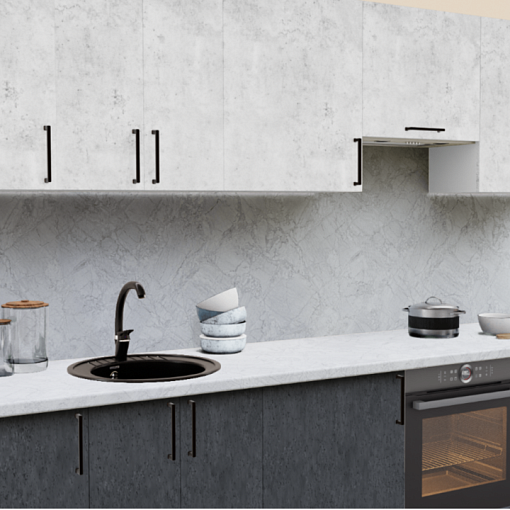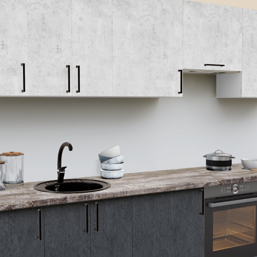 Современный кухонный гарнитур в стиле лофт с фасадами под бетон и стилизованной под камень столешницей - актуальный тренд последних лет в дизайне кухни. Лаконичные черные ручки-скобы отличное дополнение.