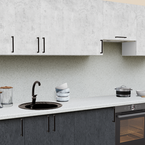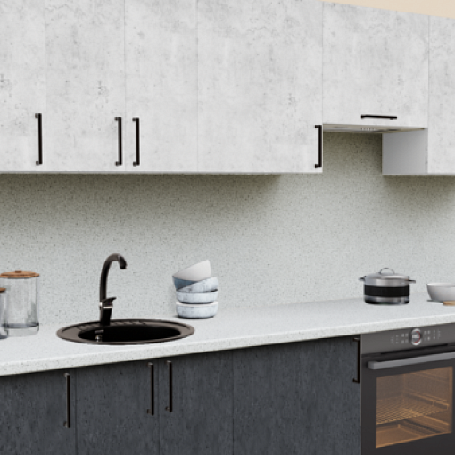 4. Прямая кухня Бетон светлый 1865 со столешницей 2047-S Кантри и со стеновой панелью 1110-S Белый.