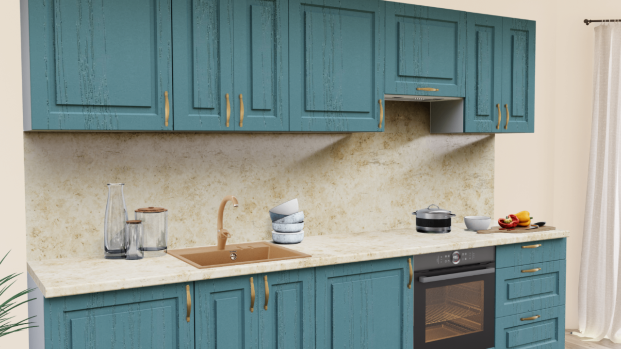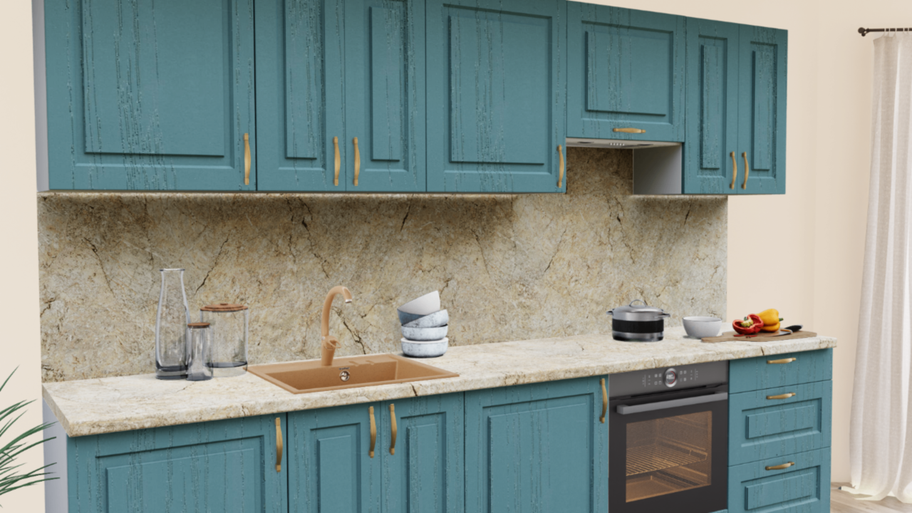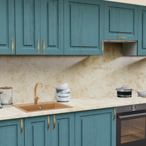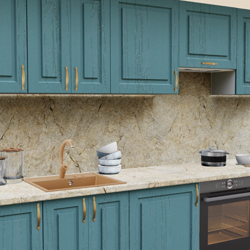 3. Прямая кухня Дуб аквамарин 162 Прямоугольник со столешницей 3024-S Мрамор золотой и со стеновой панелью 3024-S Мрамор золотой.
