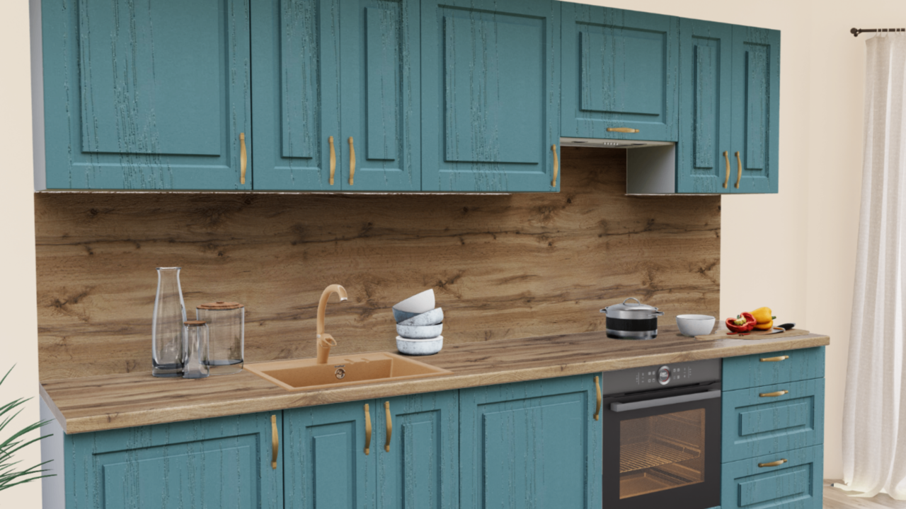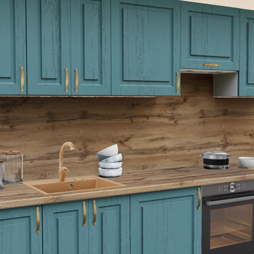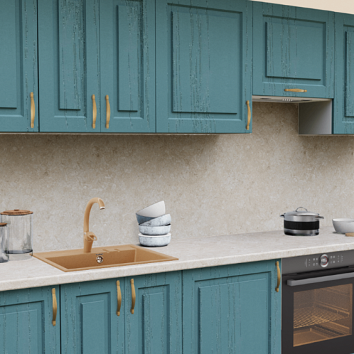 Фасады МДФ с ПВХ в цвете аквамарин создают легкое и непринужденное настроение на кухне. Классическая строгая фрезеровка смягчается элегантными бронзовыми ручками и теплыми оттенками столешницы. Свежее решение для уютной кухни.