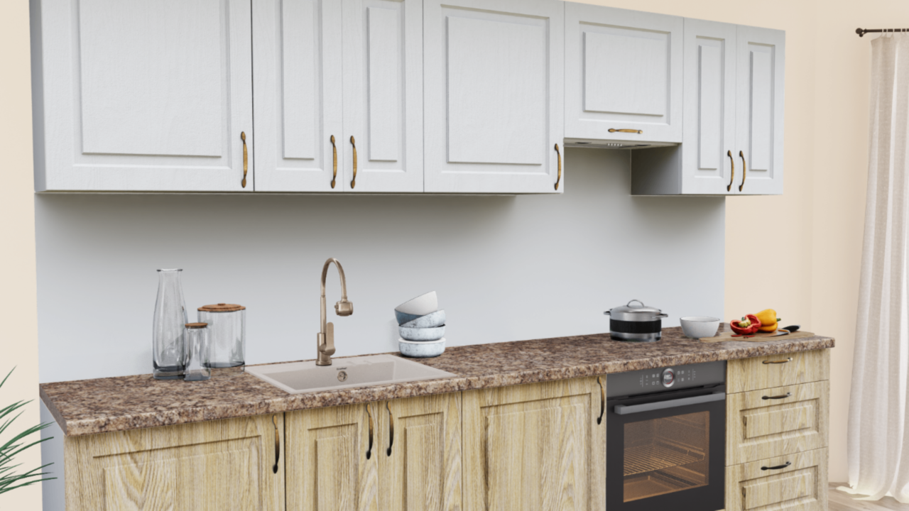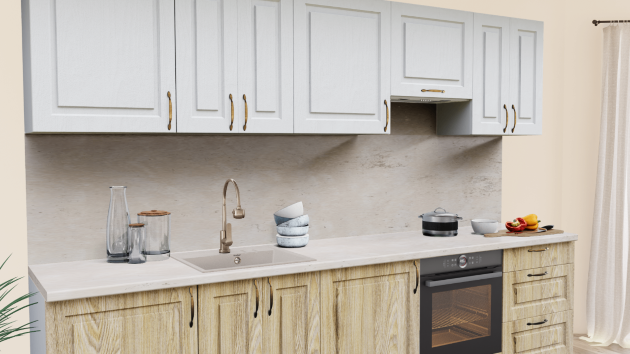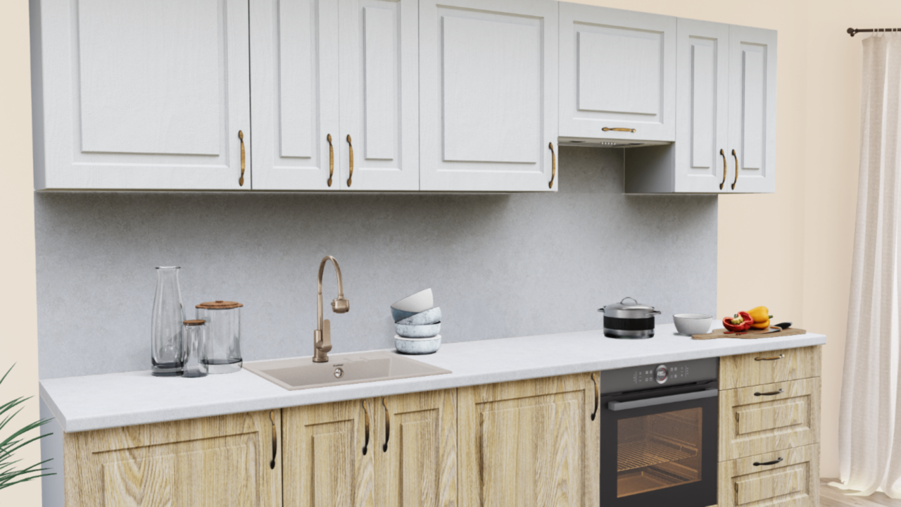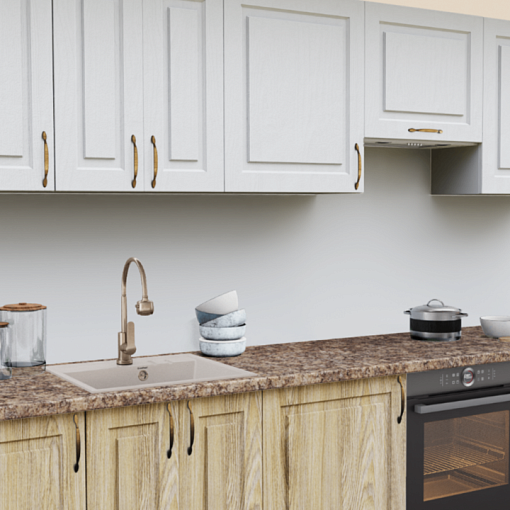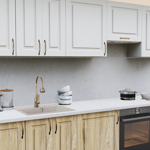 Прямой кухонный гарнитур в традиционном сочетании белого цвета верхних и теплой текстуры дерева нижних фасадов. Светлые оттенки столешницы и стеновой панели делают этот вариант уместным в разных стилистических решениях и конфигурациях.