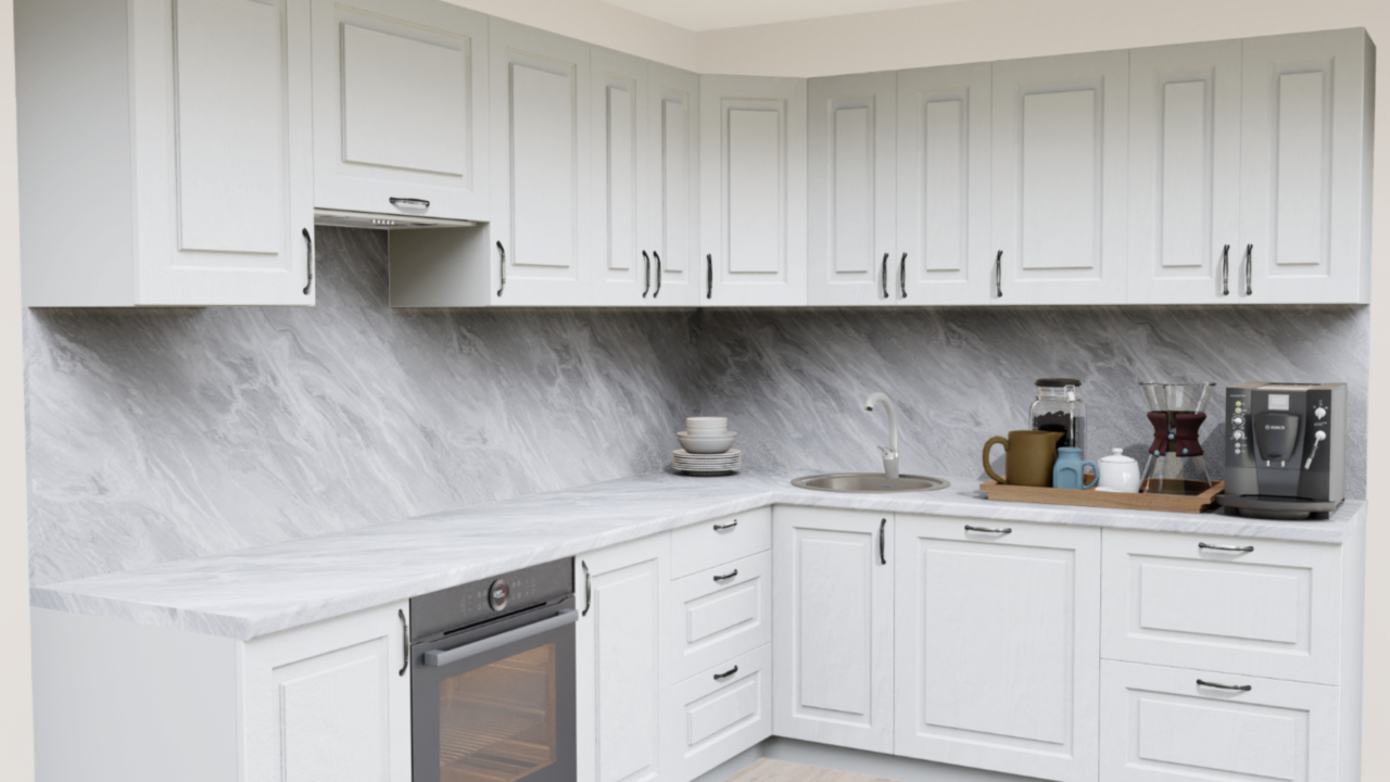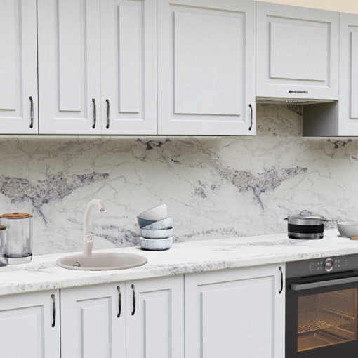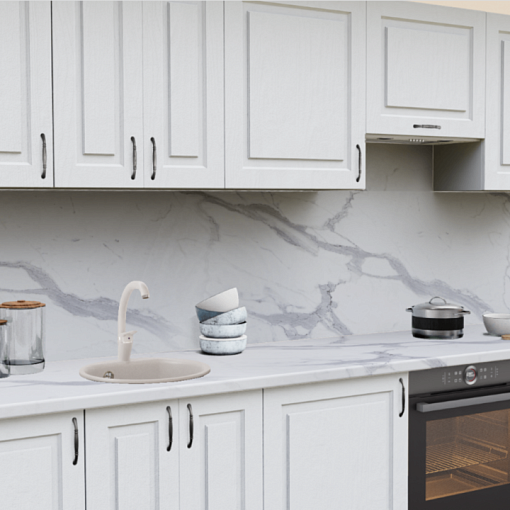 1. Прямая кухня Дуб Арктик 1929 Прямоугольник со столешницей 2384-S Мрамор греческий и со стеновой панелью 2384-S Мрамор греческий.