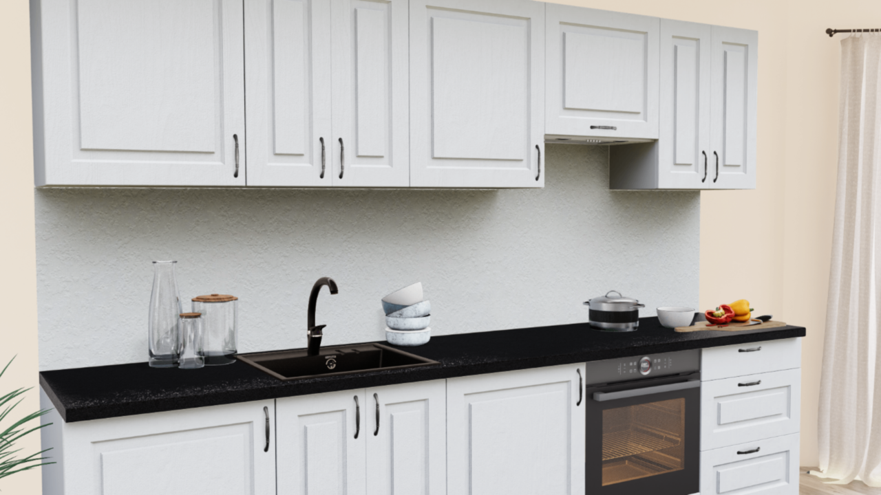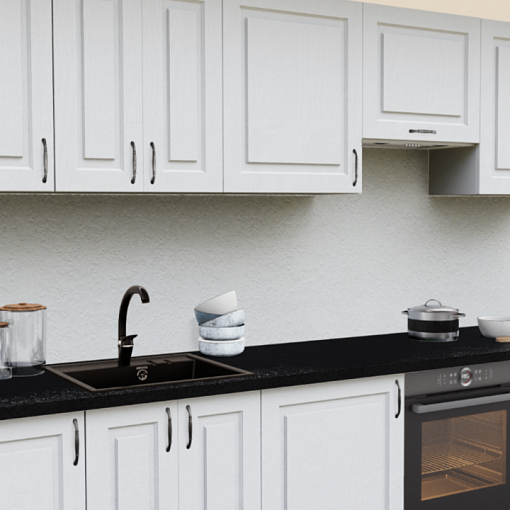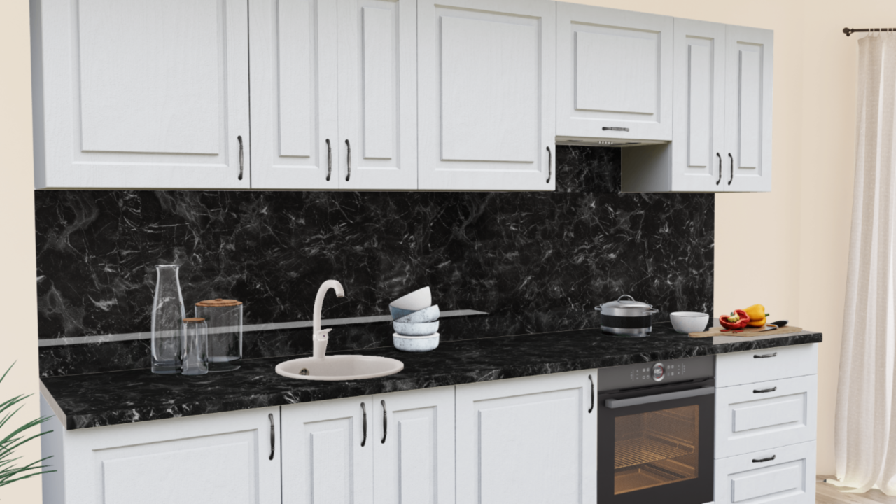 5. Прямая кухня Дуб Арктик Прямоугольник со столешницей 1021-Q Черный и со стеновой панелью 1210-Br Бриллиант белый.