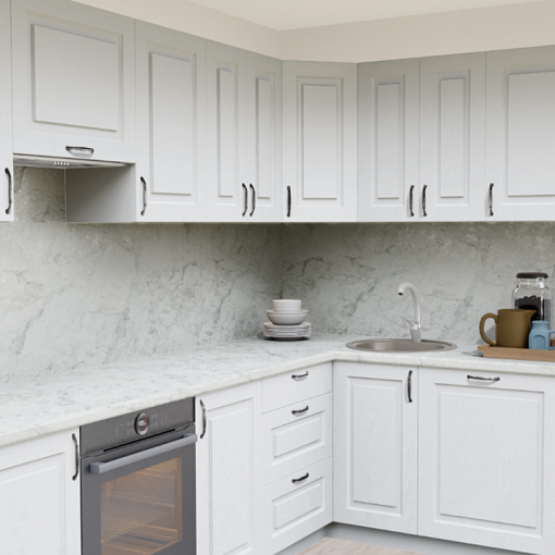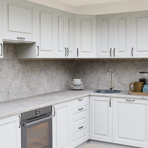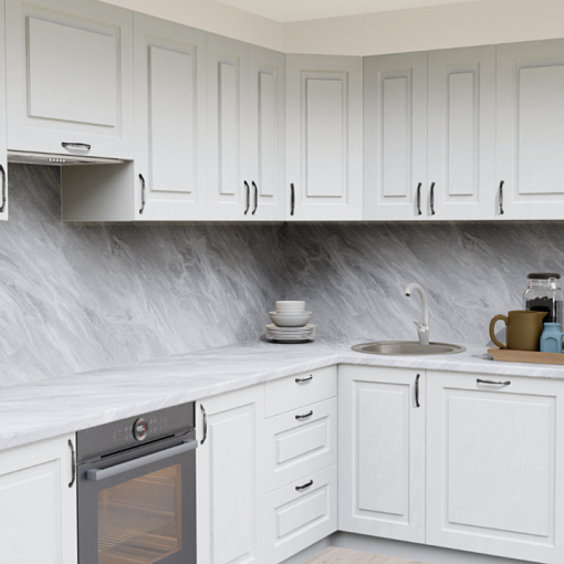 9. Прямая кухня Дуб Арктик Прямоугольник со столешницей 2349-Рt Мрамор бернини и со стеновой панелью 2349-Рt Мрамор бернини.