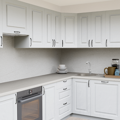Кухонный гарнитур с матовыми фасадами - основа популярного стиля неоклассика. Белый цвет и структура дерева с классической фрезеровкой делает кухню более воздушной и элегантной. Актуальности гарнитуру так же придают эргономичные ручки в цвете состаренного серебра. В зависимости от выбранного цвета столешницы кухня будет выглядеть либо легкой и изящной, либо яркой и акцентной.