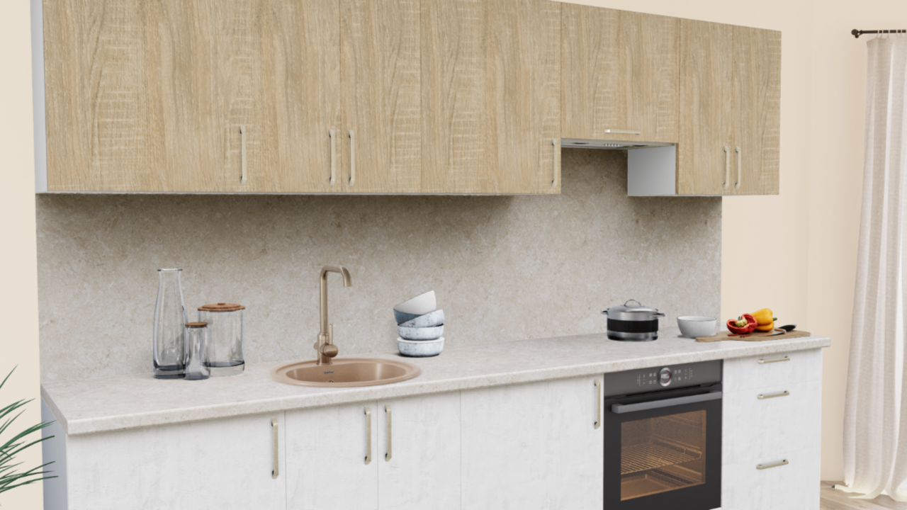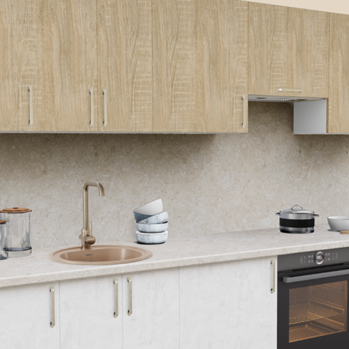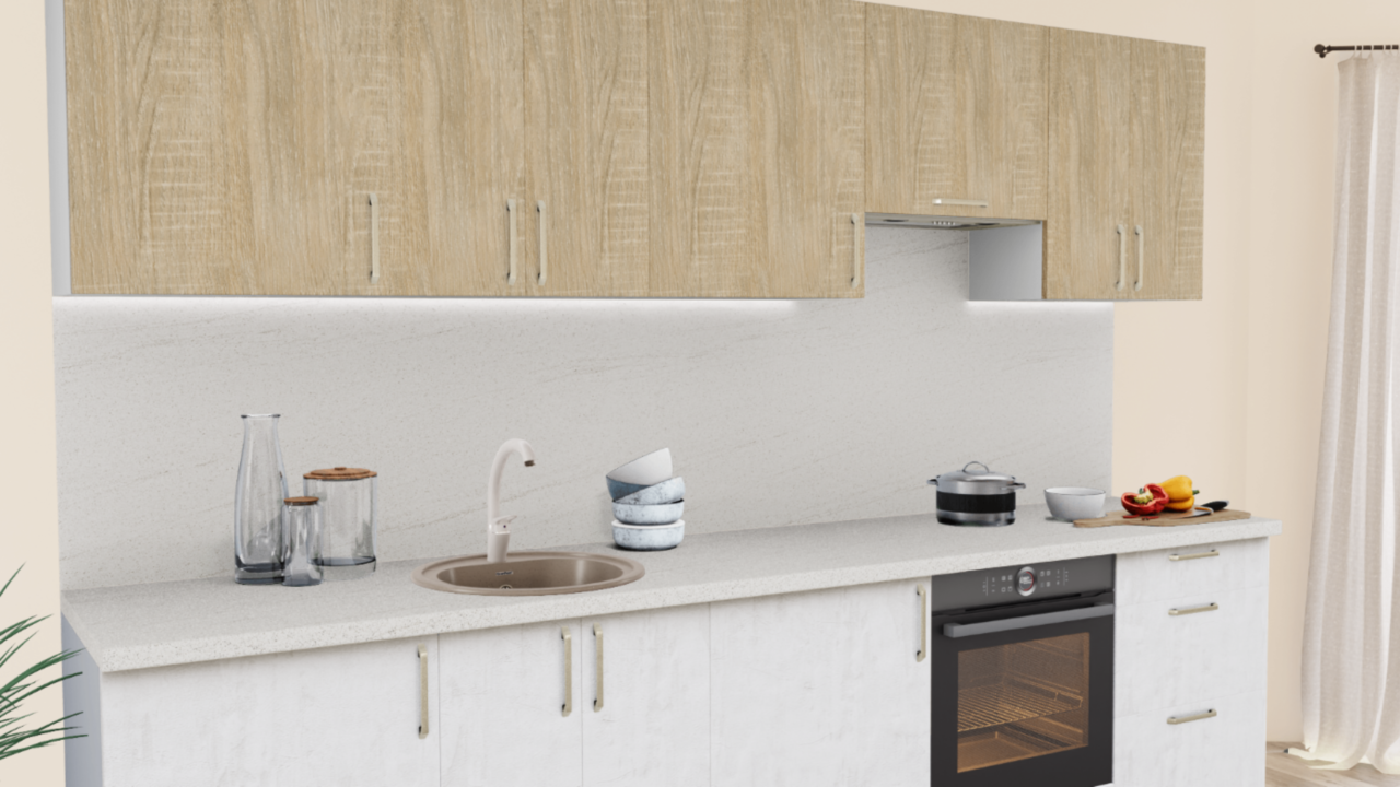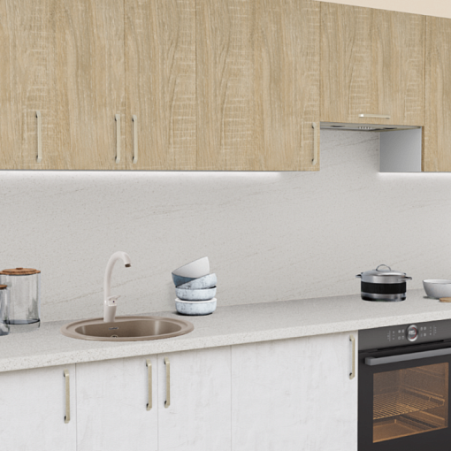 2. Прямая кухня Дуб сонома светлый 512 со столешницей 4026-Q Аламбра и со стеновой панелью 4026-Q Аламбра.