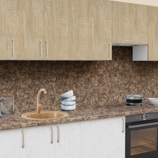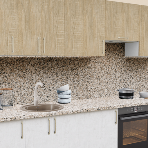 3. Прямая кухня Дуб сонома светлый 512 со столешницей 3022-S Гранит сардинский и со стеновой панелью 3022-S Гранит сардинский.