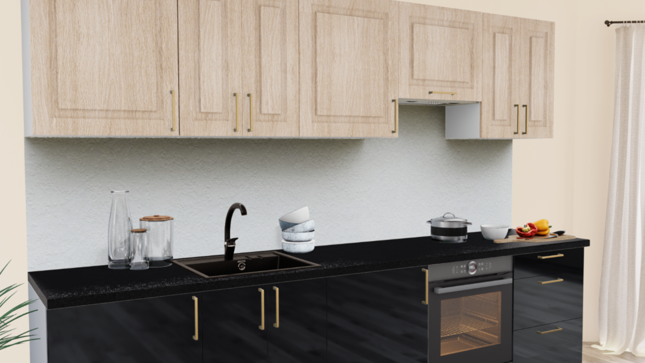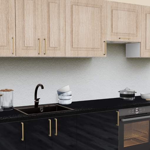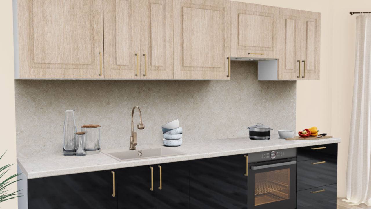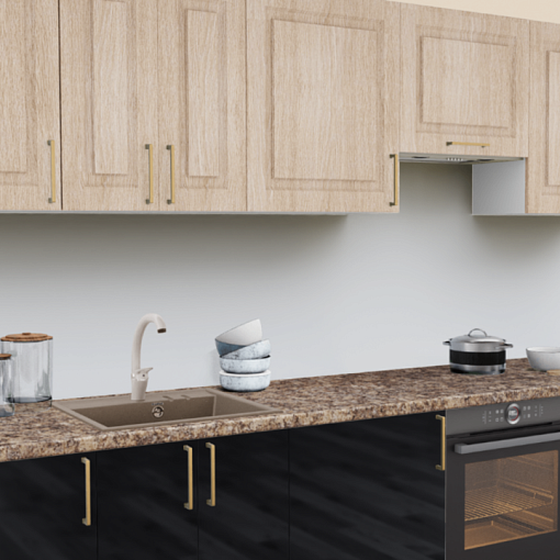 3. Прямая кухня Дуб светлый 5028 Прямоугольник со столешницей 1021-Q Черный и со стеновой панелью 1210-Br Бриллиант белый.
