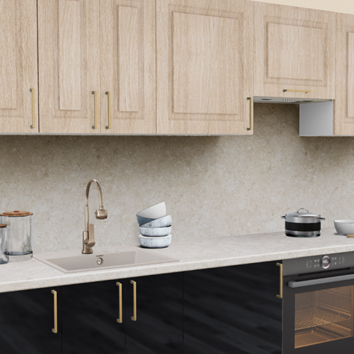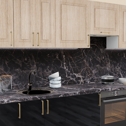 5. Прямая кухня Дуб светлый 5028 Прямоугольник со столешницей 3029-S Мрамор марквина черный и со стеновой панелью 3029-S Мрамор марквина черный.