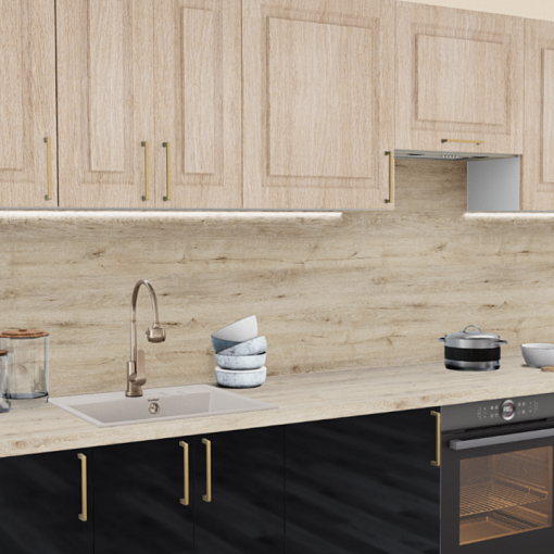 1. Прямая кухня Дуб светлый 5028 Прямоугольник со столешницей 3852-Р Дуб Корсика и со стеновой панелью 3852-Р Дуб Корсика.