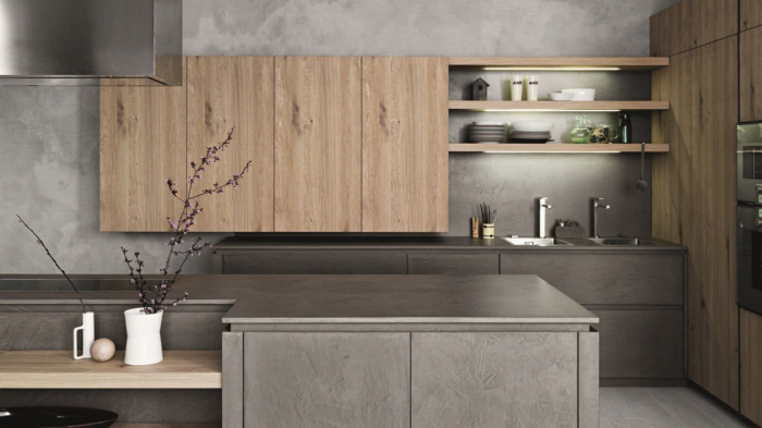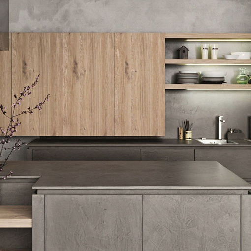 Любителям минимализма обязательно понравится кухонный гарнитур "Дуб Тоскана светлый - Бетон светлый". Актуальное сочетание серого камня с благородной текстурой дуба на верхних фасадах. Отсутствие лицевой фурнитуры и оригинальная конструкция кухни делают это решение современным и запоминающимся.