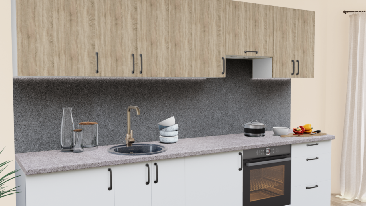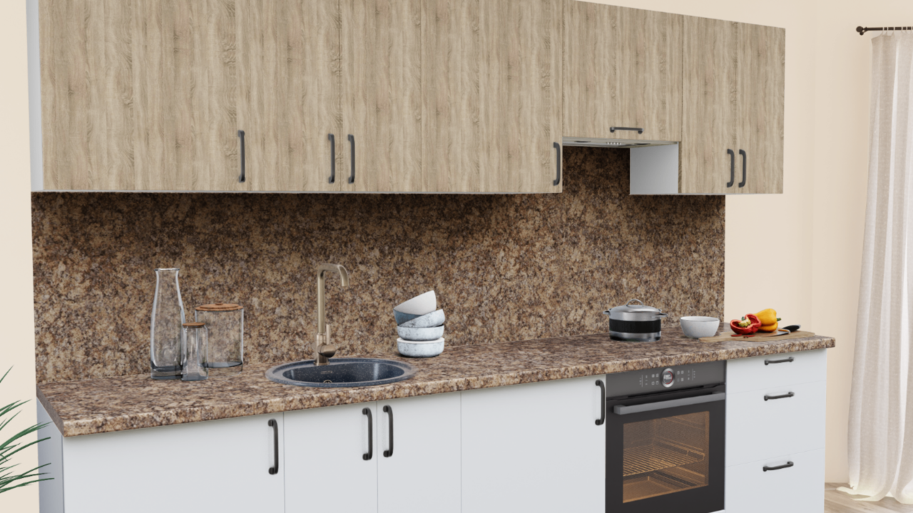 4. Прямая кухня Дуб Тоскана светлый 1549 со столешницей 7493-S Умбрия и со стеновой панелью 7493-S Умбрия.