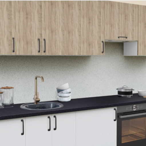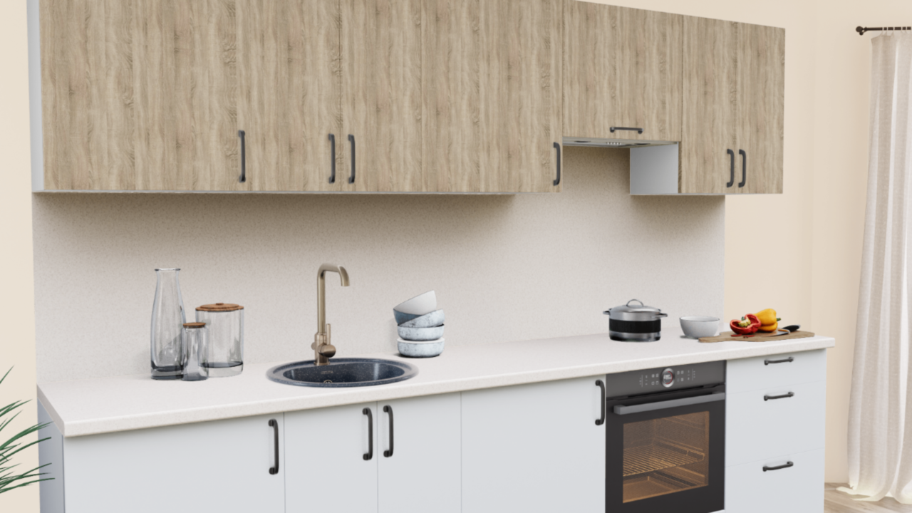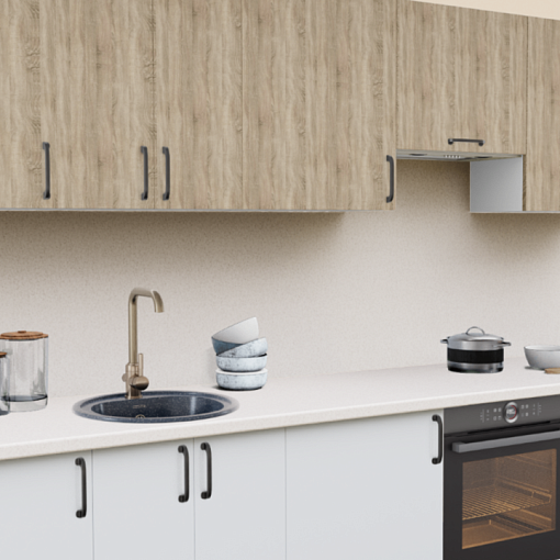Cовременная кухня с фасадами МДФ в пленке ПВХ. Актуальное сочетание текстуры дуба на верхних фасадах и нижних белых фасадов. Скандинавский стиль, который будет уместно смотреться в помещении любого размера.