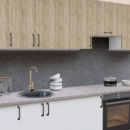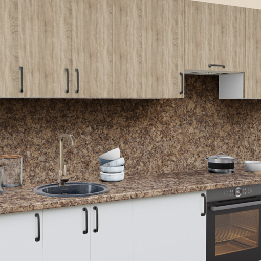 3. Прямая кухня Дуб Тоскана светлый 1549 со столешницей 4032-S Порфир и со стеновой панелью 4032-S Порфир.
