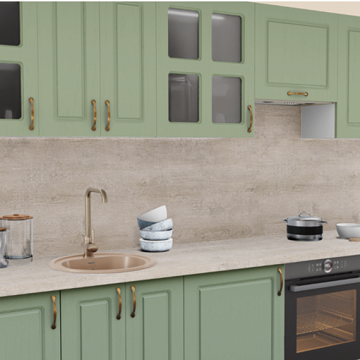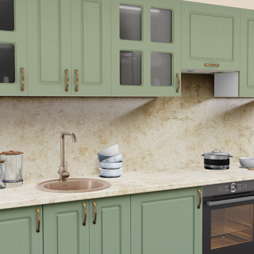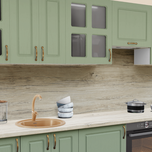 Дизайн кухни в зеленых тонах – мягок и спокоен, а классическая фрезеровка и актуальная форма витрин подчеркивает эффект крашеного дерева на фасадах. Это дружелюбный цвет для приятной атмосферы дополняется теплыми оттенками столешницы и стильными бронзовыми ручками.