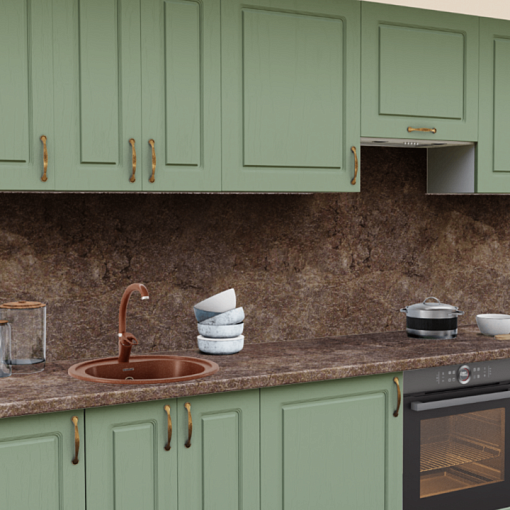 3. Прямая кухня Эмаль лесная 1333 Квадро со столешницей 910-Br Обсидиан коричневый и со стеновой панелью 910-Br Обсидиан коричневый.