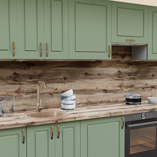 2. Прямая кухня Эмаль лесная 1333 Квадро со столешницей 521-S Береза Сандал и со стеновой панелью 521-S Береза Сандал.