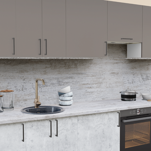 4. Прямая кухня Графит глянец 2129 со столешницей 7050-М Винтажная сосна и со стеновой панелью 7050-М Винтажная сосна.