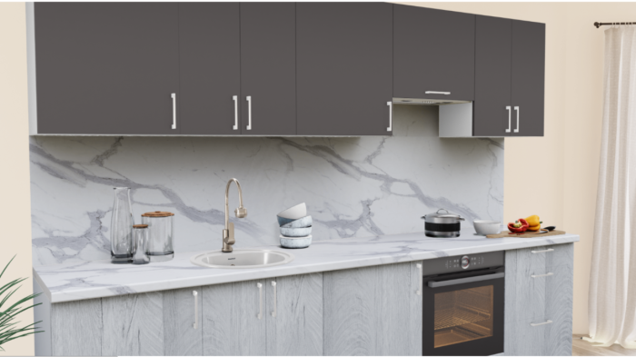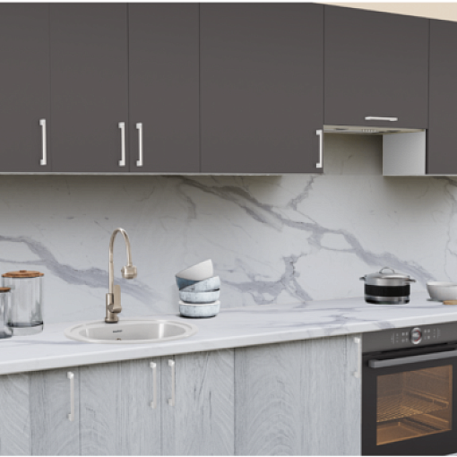 3. Прямая кухня Грей нубук 2116 со столешницей 3025/Q Мрамор черный и со стеновой панелью 3025/Q Мрамор черный.