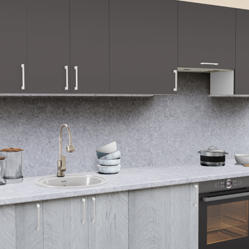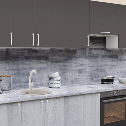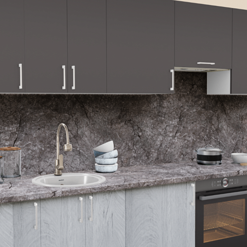 4. Прямая кухня Грей нубук 2116 со столешницей 1021-Q Черный и со стеновой панелью 2919-S Ассиметрия.