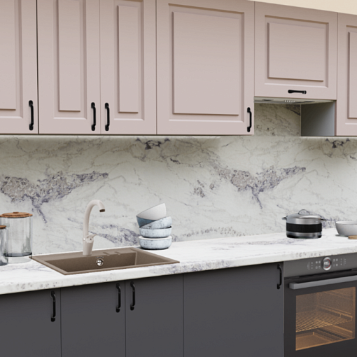 3. Прямая кухня Латте 854 Прямоугольник со столешницей 2384-S Мрамор греческий и со стеновой панелью 2384-S Мрамор греческий