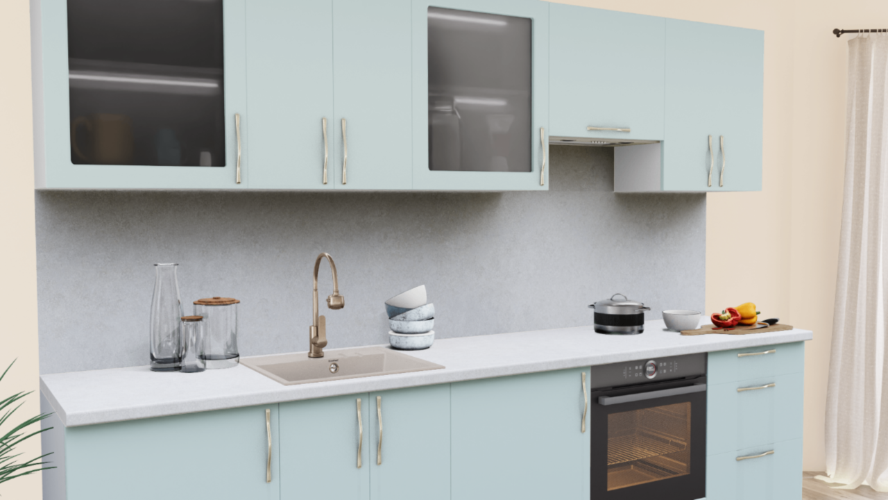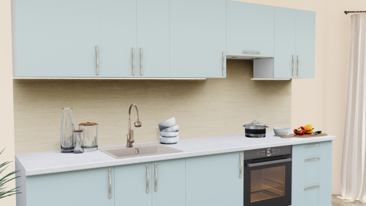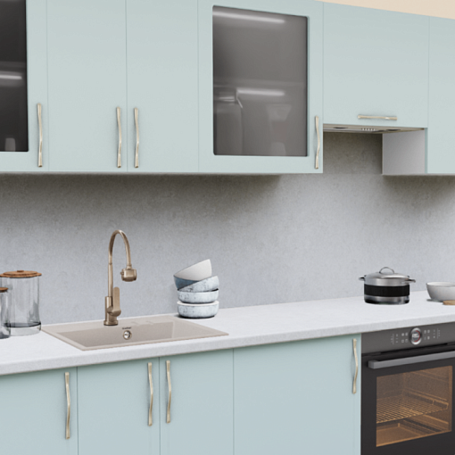 Визуально расширить пространство можно с помощью нежно-голубого кухонного гарнитура "Ниагара". Пастельные оттенки фасадов МДФ в пленке ПВХ будут гармонично смотреться на любом размере кухни, а светлая столешница и стеновая панель добавит воздушности всему интерьеру. Современный минималистичный дизайн смягчают плавные линии ручек из светлого металла.