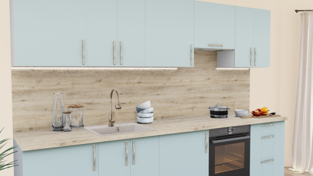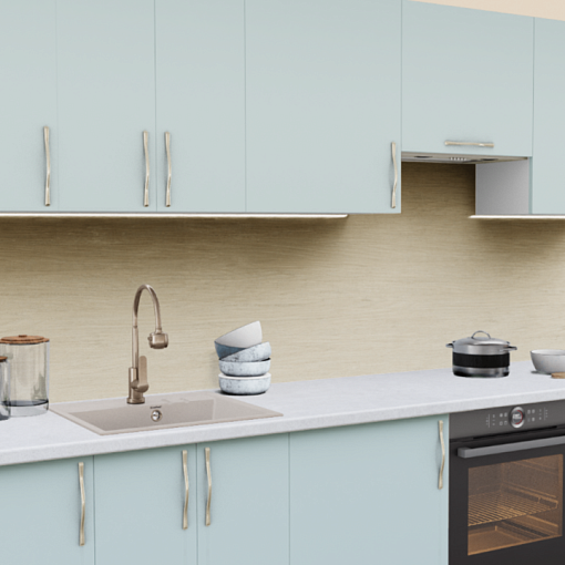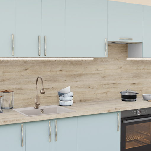 3. Прямая кухня Ниагара 015 со столешницей 9022-S Дуб выбеленный и со стеновой панелью 9022-S Дуб выбеленный.