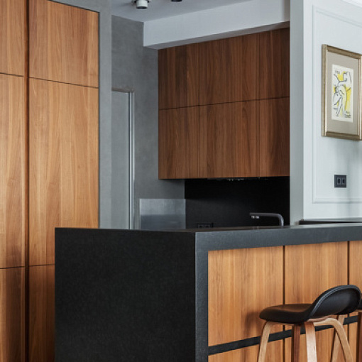Яркий кухонный гарнитур с фасадами из ореха и тёмной каменной столешницей - тренд в дизайне последнего года. Отсутствие лицевой фурнитуры делает эту кухню ультрасовременной и практичной.