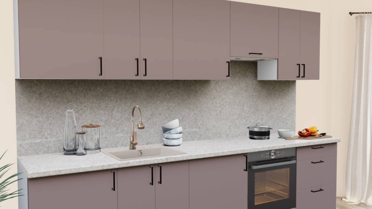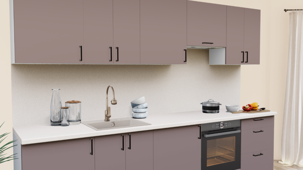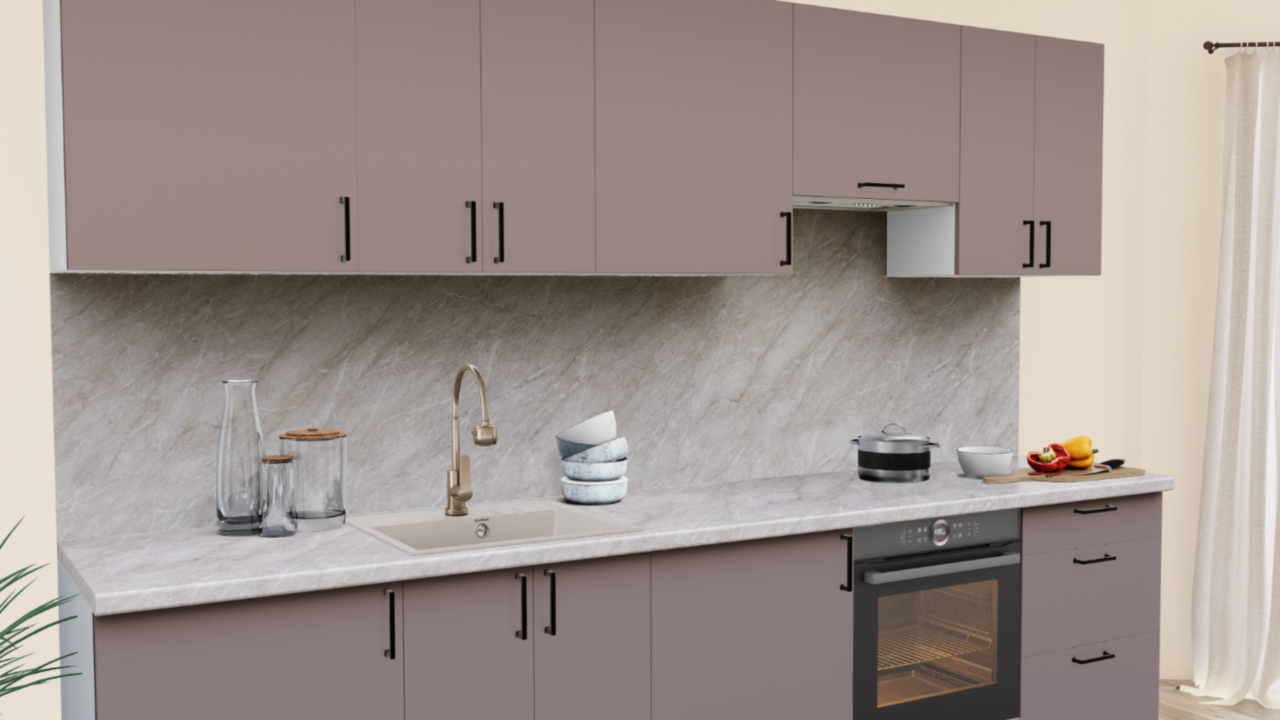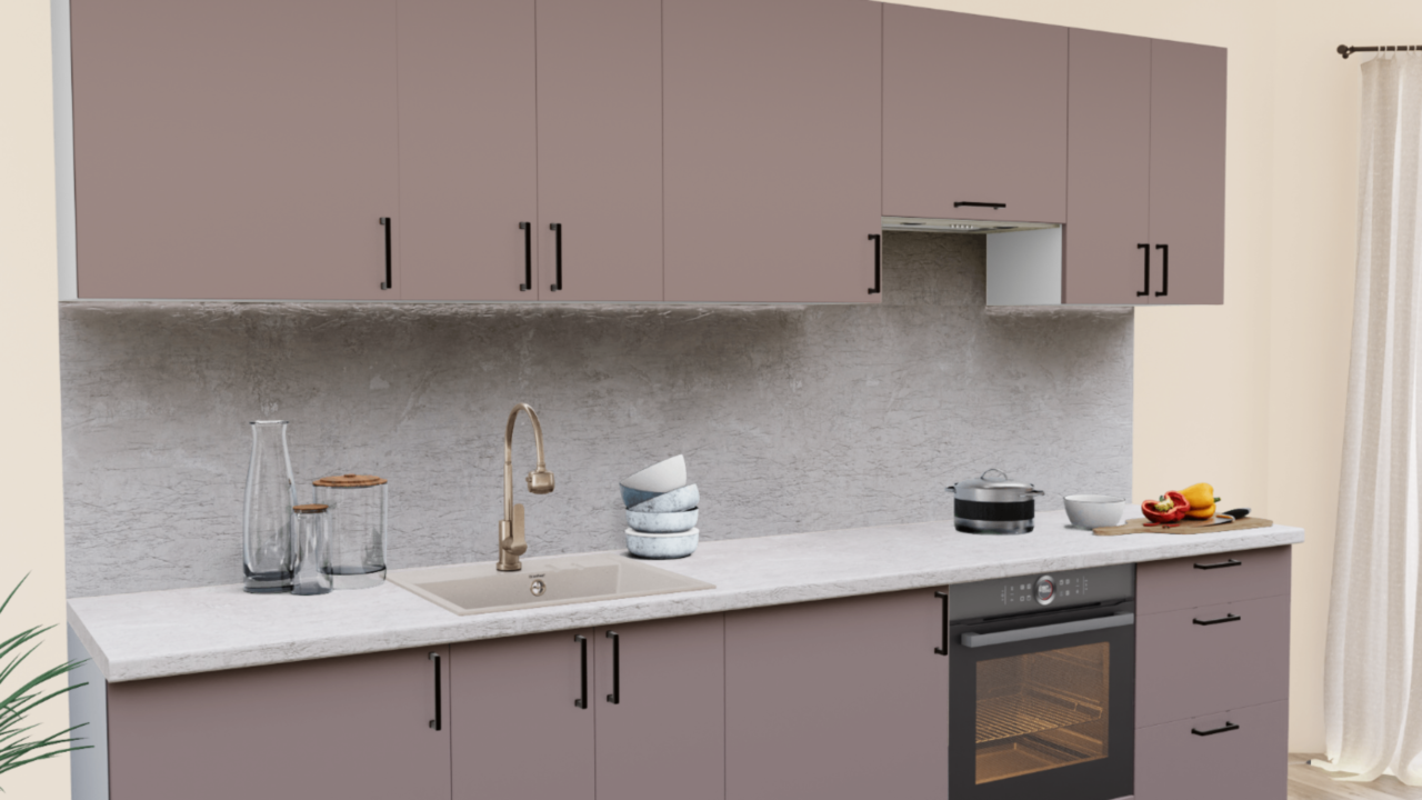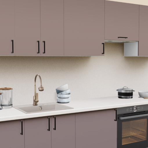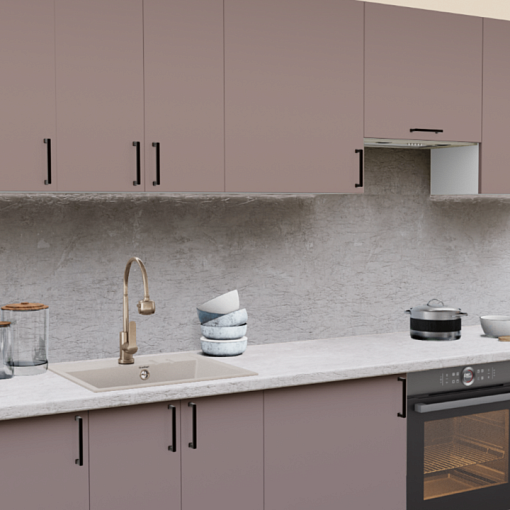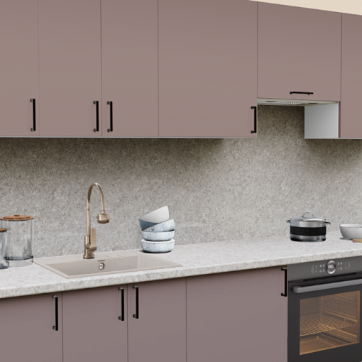 Пастельные оттенки в сочетании с матовой текстурой - тренд последних лет в проектировании интерьера кухни. Эргономичные темные ручки и теплые оттенки столешницы завершают образ кухонного гарнитура.